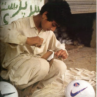 Bolas de Futebol da Nike são feitas em pequenos quartos sem janelas, por velhos jovens e crianças sentados no chão de cimento em pequenas aldeias do Afeganistão.