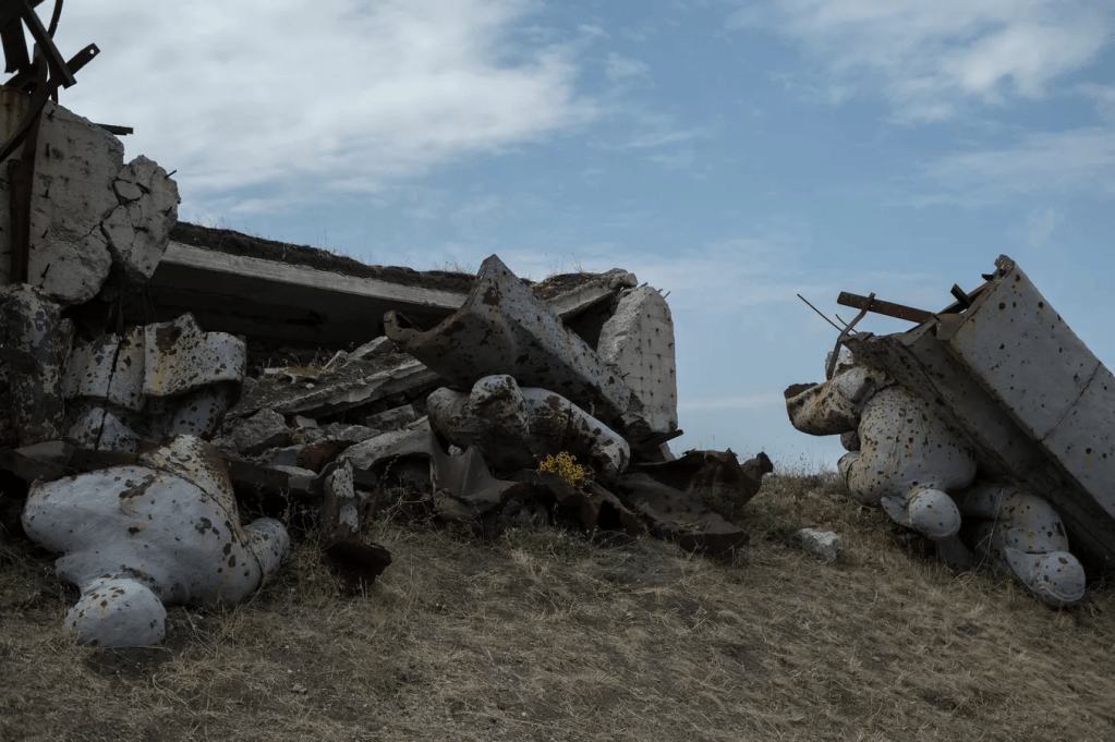 O memorial foi destruído em intensos combates entre as milícias do Donbass e as forças ucranianas em 2014.