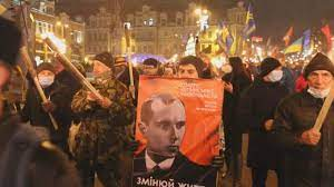 Na imagem, saudação a Bandera, nazista Ucraniano co-responsável pela morte de 100.000 ucranianos.