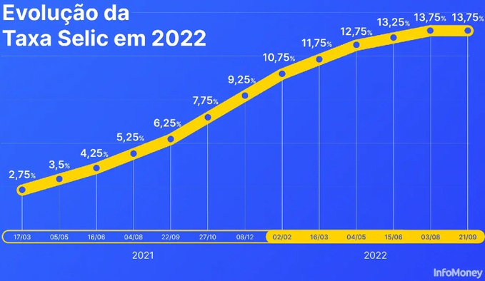 No gráfico abaixo (do INFOMONEY) podemos notar que a SELIC começou sua escalada vertiginosa justamente em 2022, passando de uma casa para duas. Coincidência ou não, foi justamente este ano em que o BIS começou sua orientação destinada aos EUA para que aumentasse suas taxas de juros.