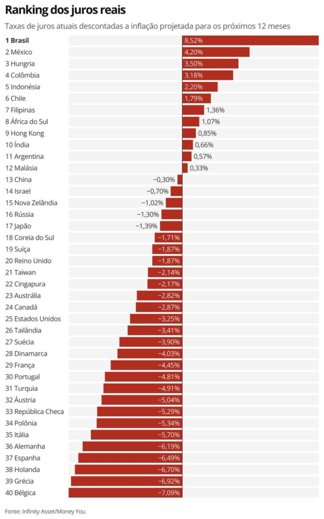 Abaixo, gráfico com algumas taxas de juros descontadas a inflação projetada para os próximos 12 meses em alguns países, notamos que uma taxa anual de 13,75% está acima de qualquer estimativa, favorecendo o sistema especulativo, fonte Infinity Asset