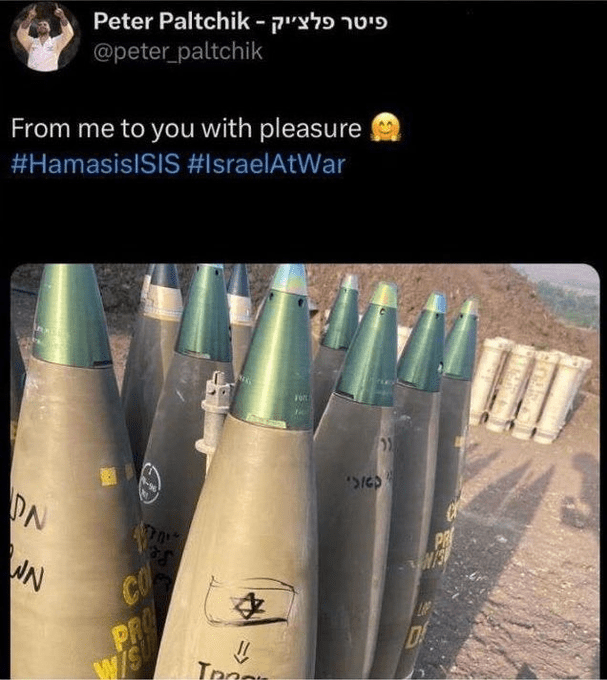 Porta-bandeira de Israel assinou mísseis lançados na Palestina. Peter Paltchick é defensor e avalista de bombardeios sobre a Palestina, extremista, apoia o genocídio em Gaza, assinou mísseis que assassinaram em Gaza e agrediu ativistas pró-palestinos nas Olimpíadas do Japão.