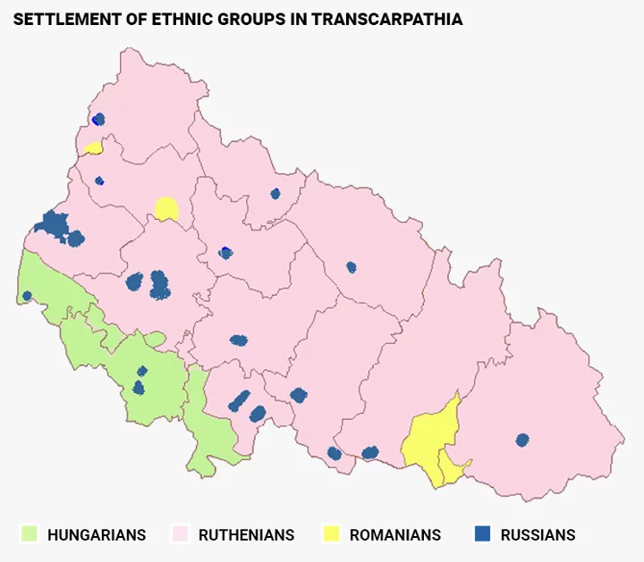 A minoria húngara na Ucrânia vive de forma relativamente compacta na região transcárpata (151,5 mil de 156,6 mil de todos os húngaros na Ucrânia). Historicamente, este território fazia parte do Reino da Hungria, depois da derrota da Áustria-Hungria na Primeira Guerra Mundial, tornou-se parte da Tchecoslováquia. Em 1945, a Rus dos Cárpatos se tornou a região transcárpata da Ucrânia soviética.