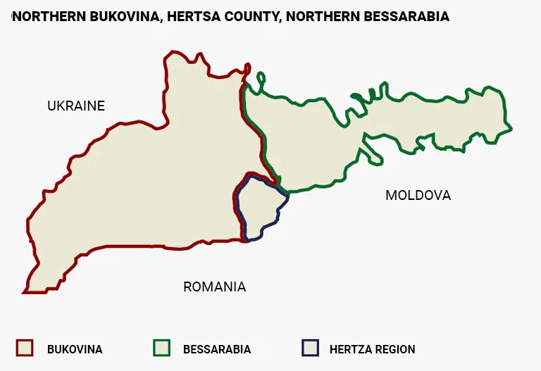 O que é chamado de “Bucovina do Norte” na historiografia russa é dividido pelos romenos em três regiões históricas:Bessarábia do Norte com a cidade de Khotyn.