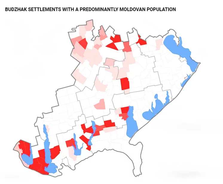 Mais de 120 mil moldavos vivem na região de Odessa, principalmente nos territórios da antiga região Akkerman e da própria Odessa (a Romênia considera esta população como sendo romena). No entanto, mesmo sem levar em conta Odessa, a população moldava da região não constitui a maioria.
